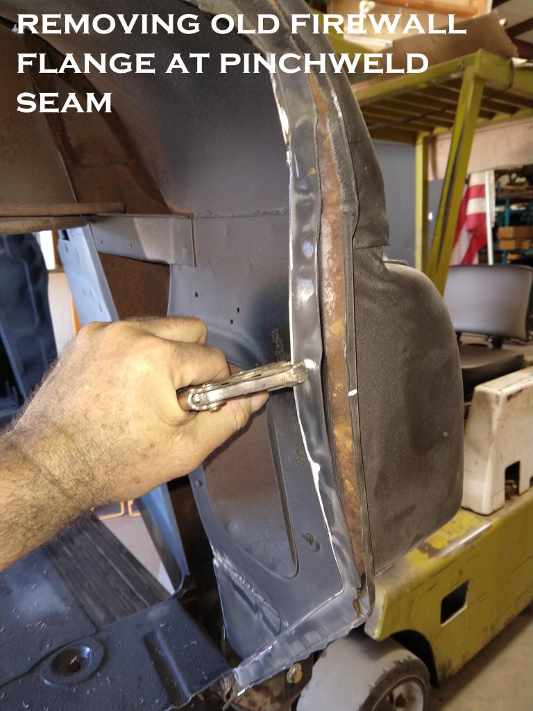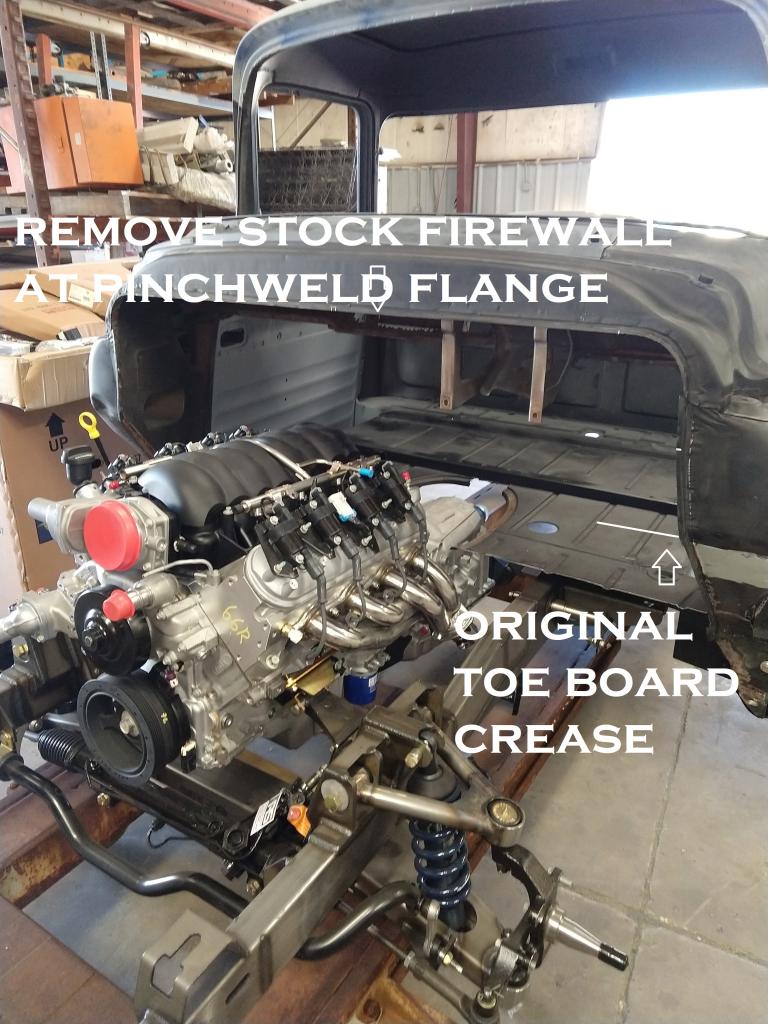 Remove the factory firewall at the firewall to cowl top/side pinchweld flange. If installing our EFK-5559 Extended Floor Kit, remove all the way to toe board to floor crease. If maintaining the stock toe board, only cut to top of toe board to firewall face crease.