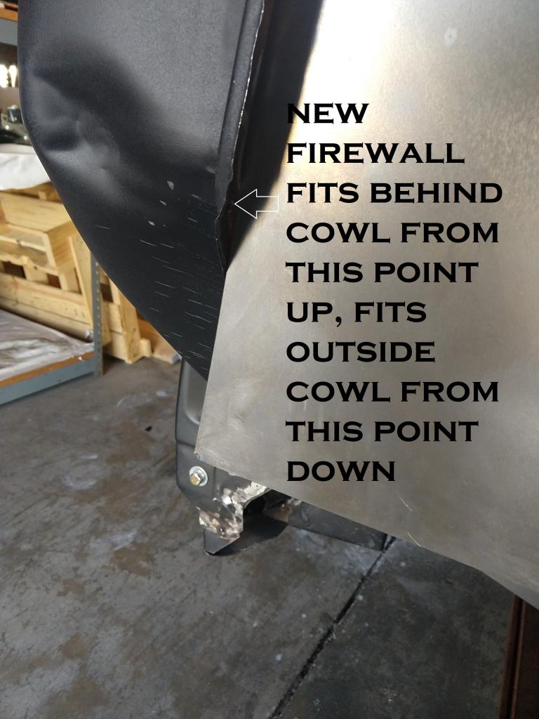 The new firewall slips just behind the inner edges of the cowl sides and top. Trim as needed for precise fit. This way, the new firewall can be welded to the cowl from inside the cab. Be sure and mark the location of hood hinge holes from the old firewall and transfer to the new firewall. Either use nut inserts or welded nuts from behind to secure new hood hinge mounts.