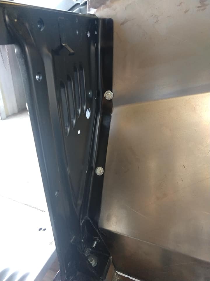 To complete the installation, drill two 3/8" holes in the core support flange each side to correspond with the holes in the new inner fenders. Install 5/16" fasteners.