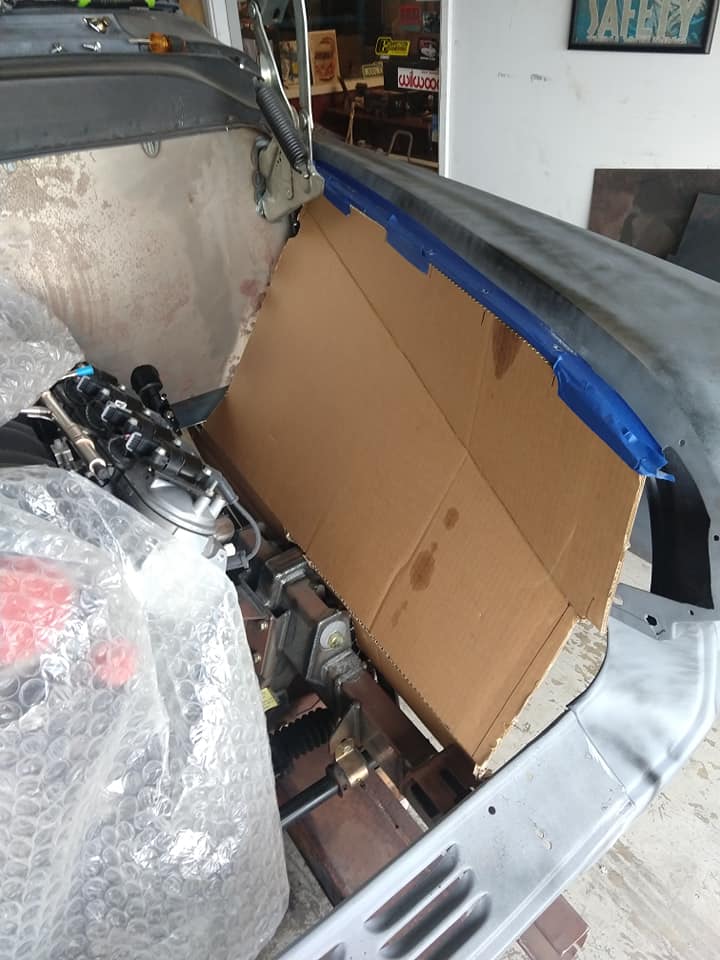 Use the shipping box to trace an outline of one of the inner fenders and cut and fold to match the shape. Use this cardboard template to test fit and trim as needed to fit your firewall and chassis.