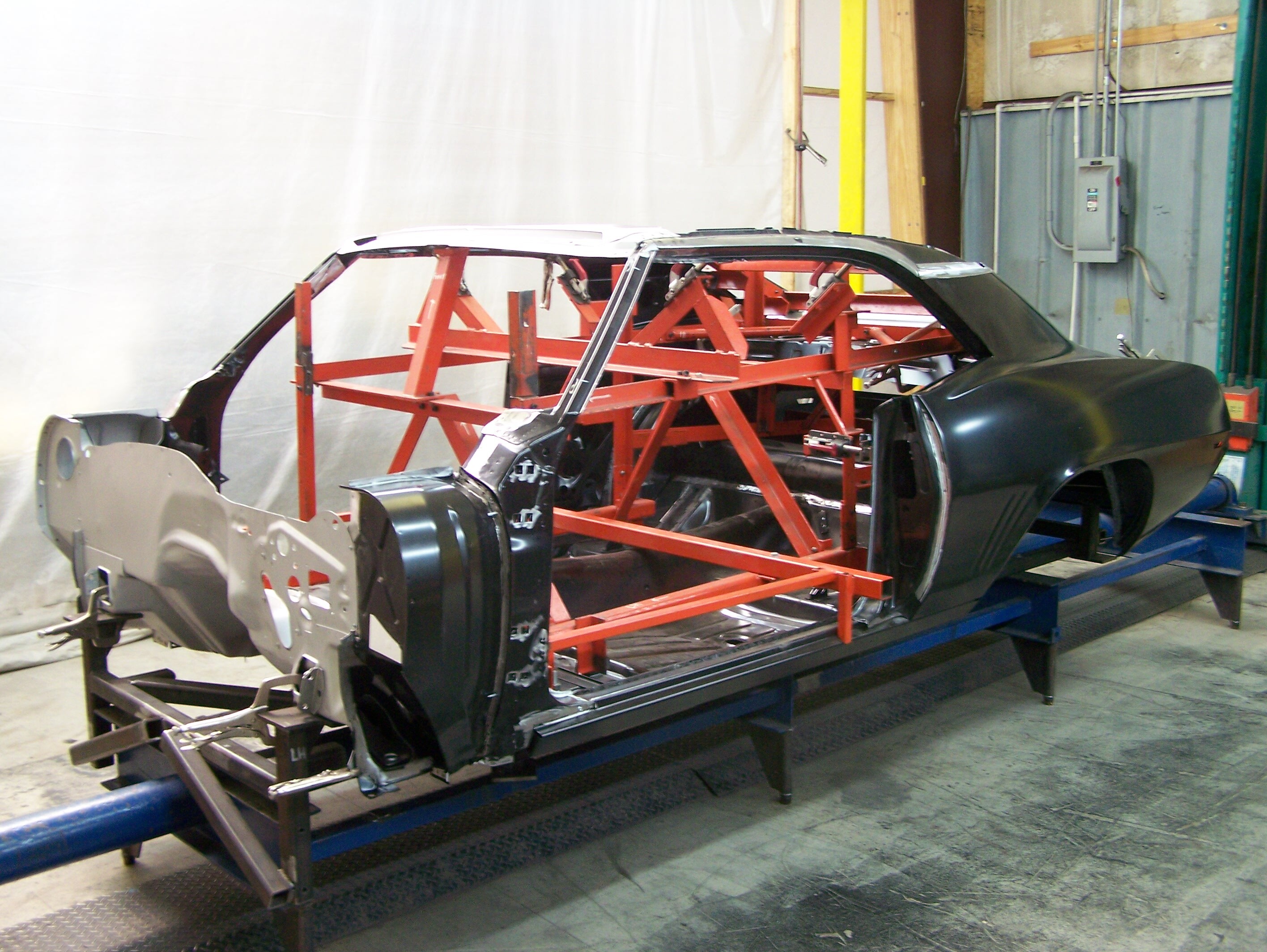 The full floor and trunk pan were assembled first -- upside down -- on the special floor fixture. Once spot welding of the floor assembly was completed, it was placed on the RDS platform/rotisserie and all internal fixtures were bolted in place. These fixtures ensure that all of the remaining structural components are assembled in the correct locations for each and every build. This particular body was built with the smooth heater delete firewall, wider wheel tub (allows up to 335mm of rear rubber) and RS options. All of the exterior panels on all RDS 67-69 Camaro coupes come from Auto Metal Direct (AMD). www.autometaldirect.com