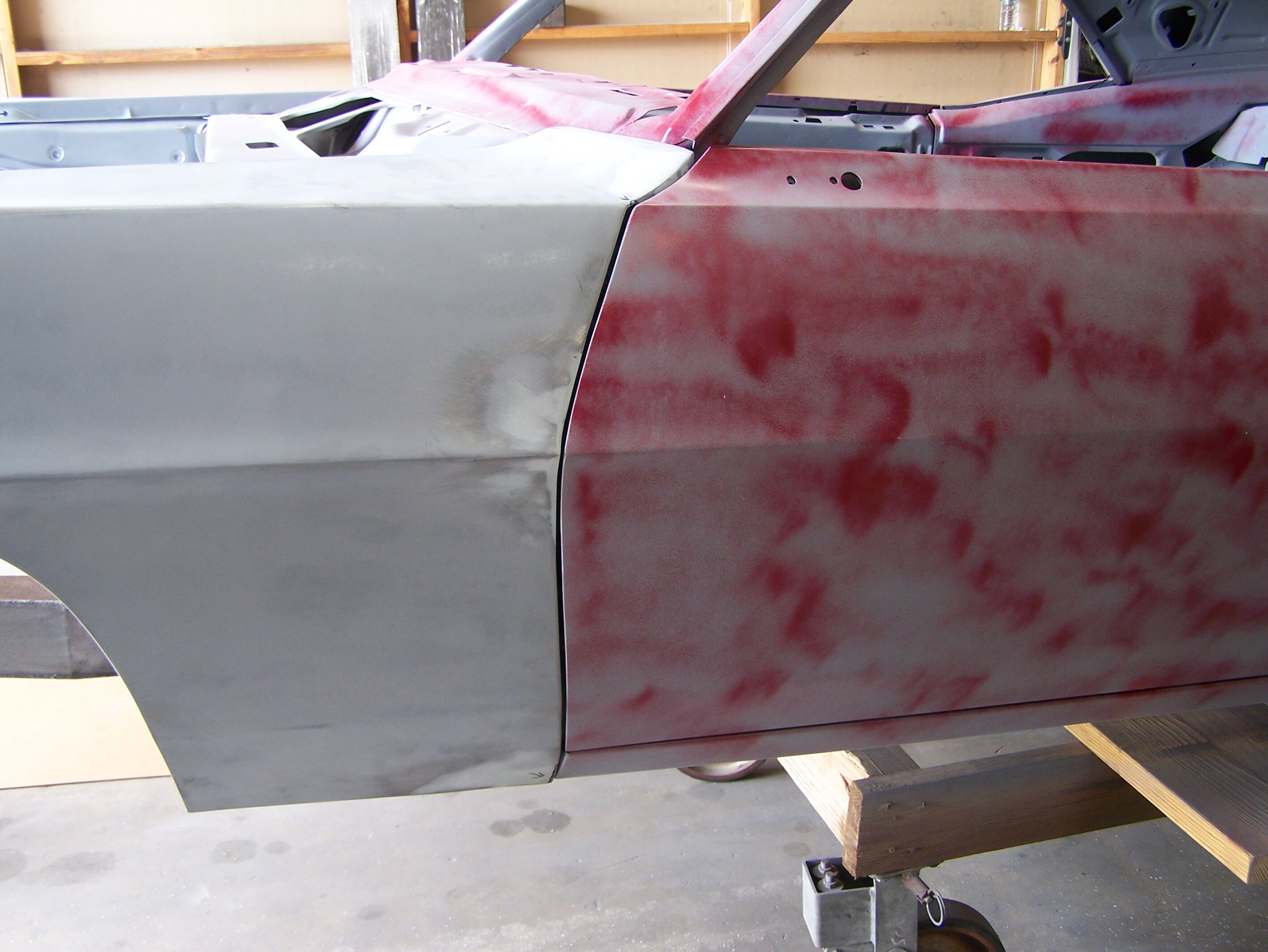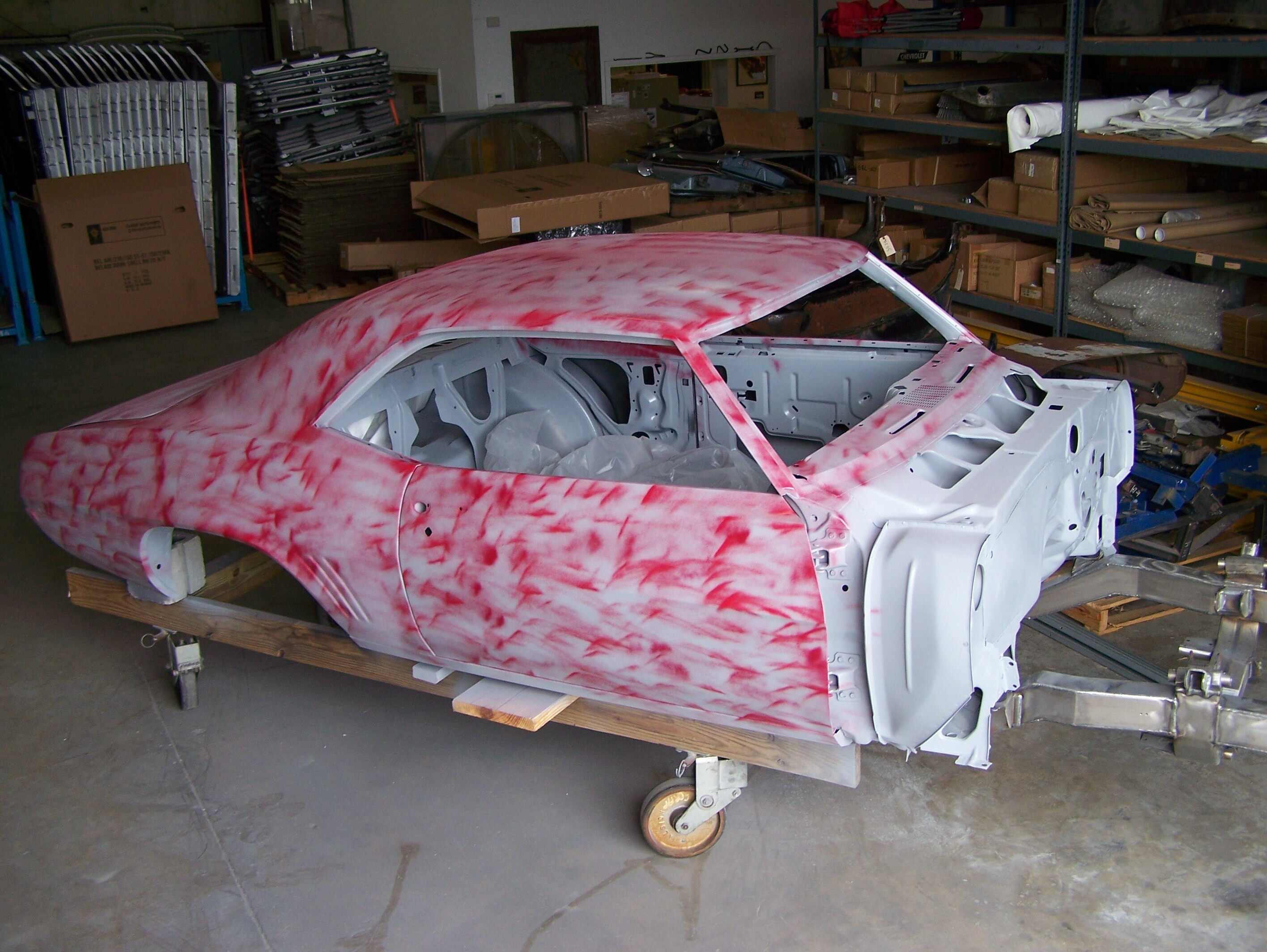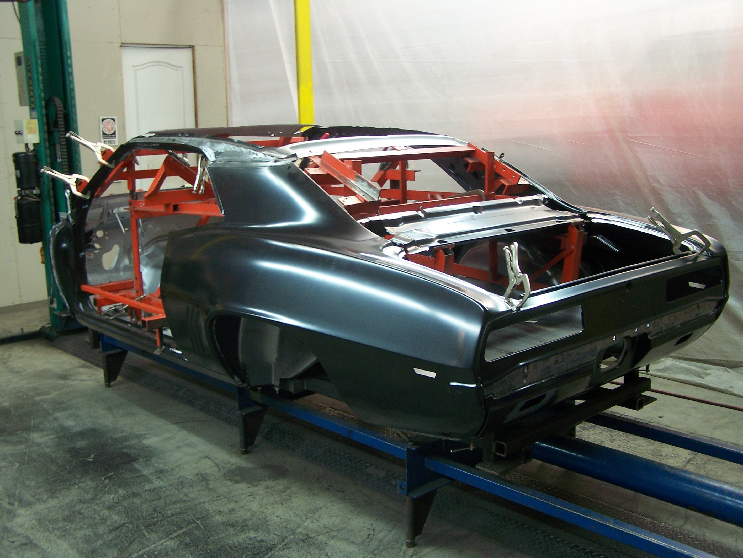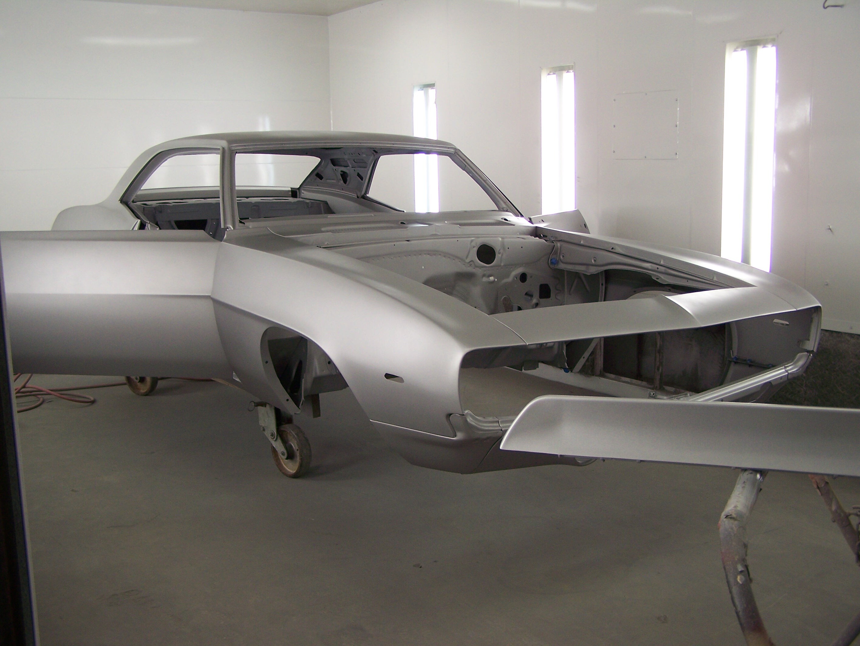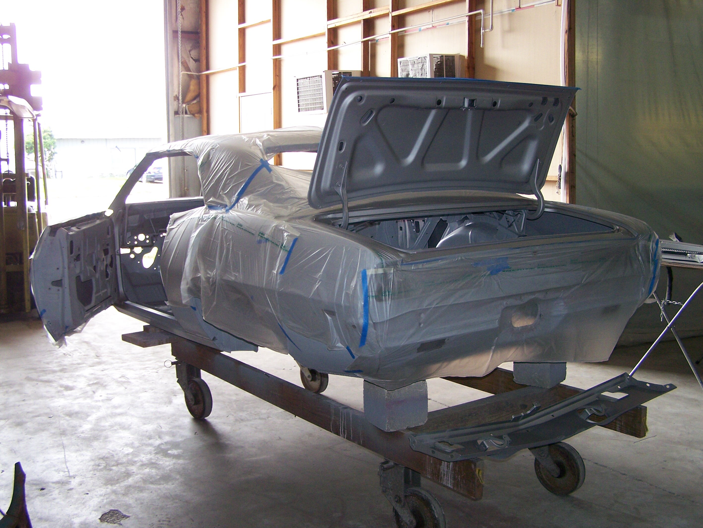 Before going to the spray booth, the door jambs, trunk jambs, fender jambs were all “jambed”, which means these areas were painted now so the fenders could be installed on the body for the final paint process.