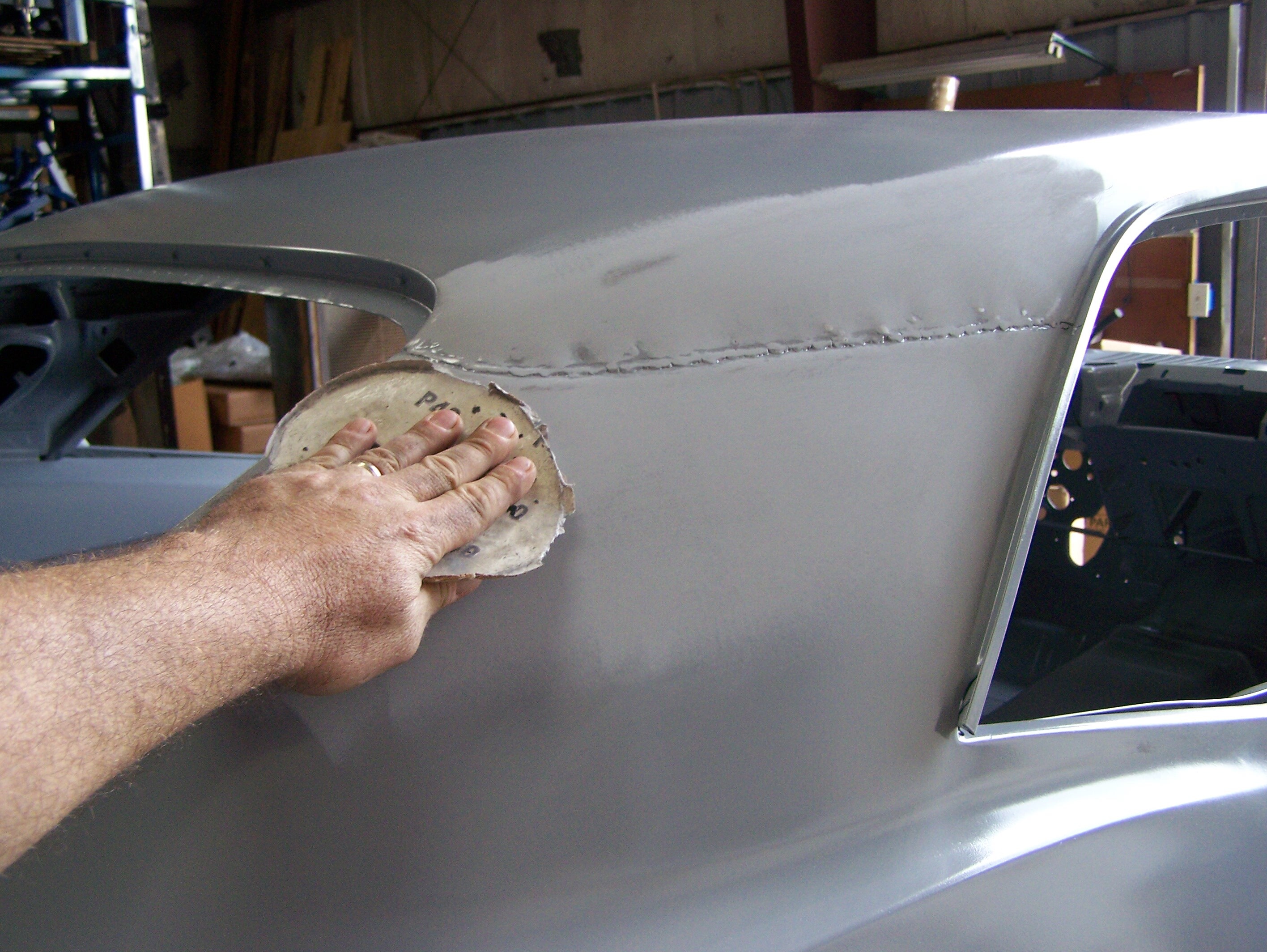 Our new body had picked up a ding or two from sitting around the shop so these areas were metal-worked and filled where needed.