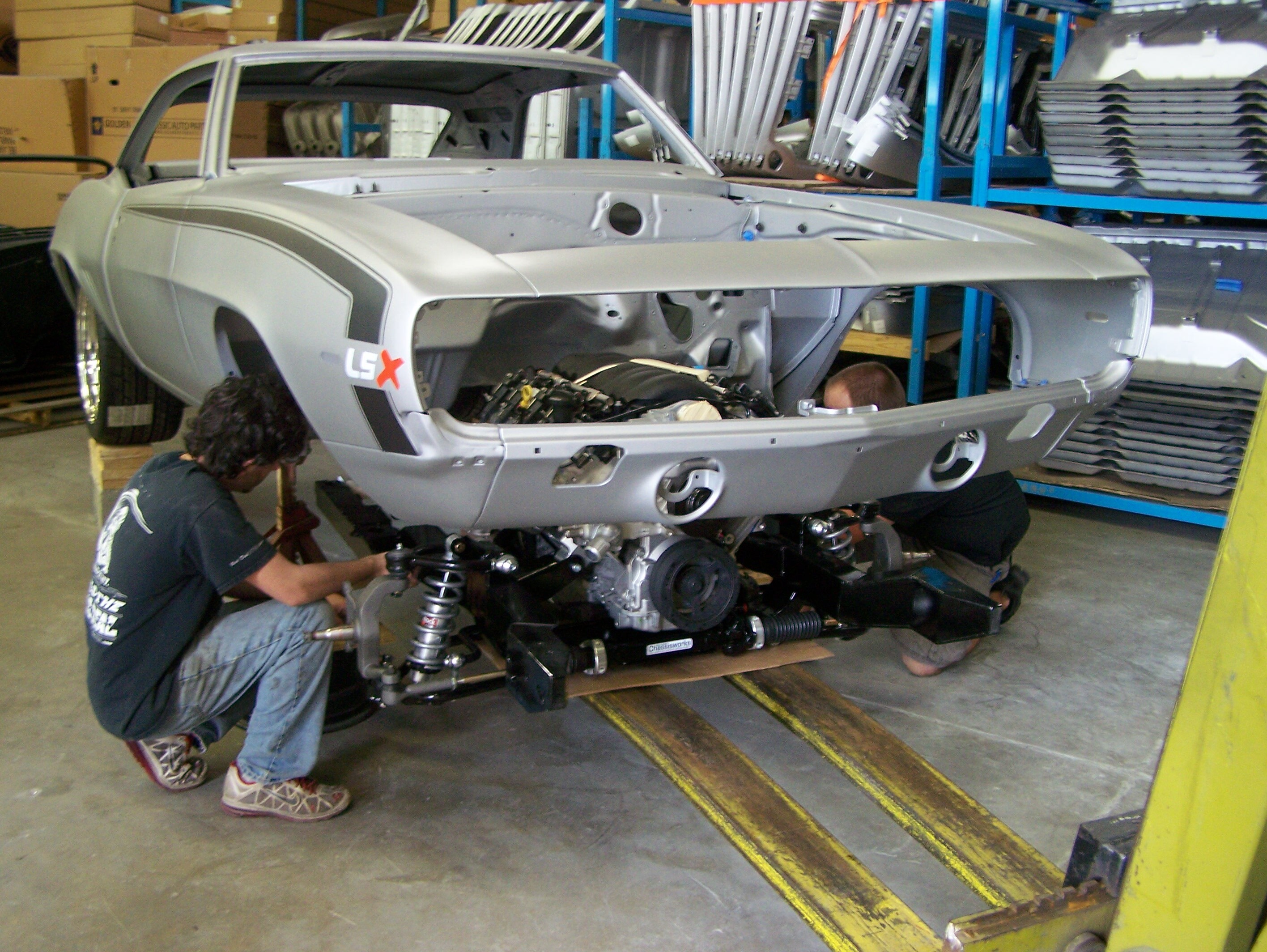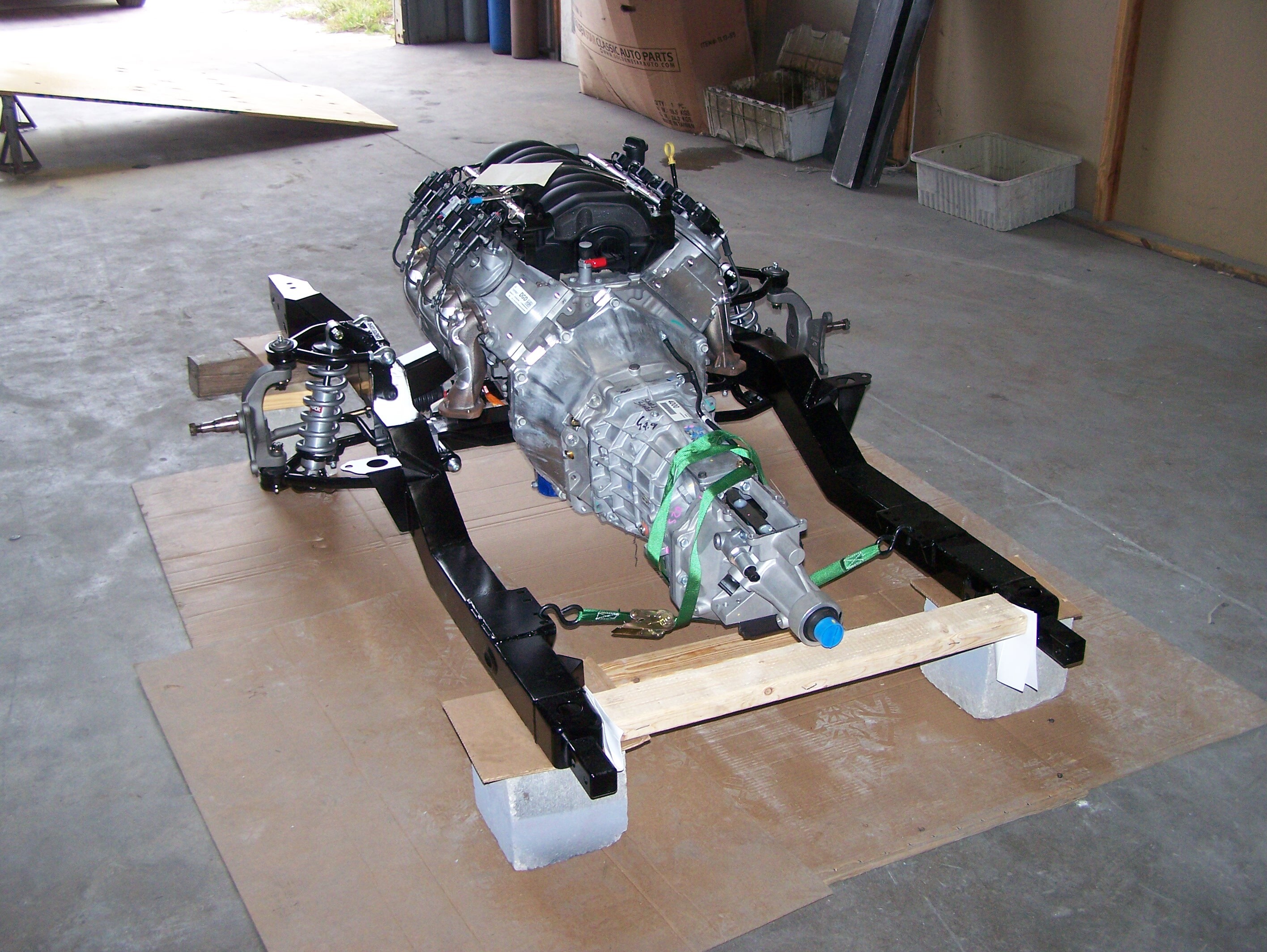 Once the front frame clip was fully assembled, the 376 ci/480 HP LS3 with Super Magnum T56 6-speed Connect and Cruise package from Chevrolet Performance and Skoggin-Dickey Parts Center www.sdparts.com was installed in the frame. The transmission tail shaft was artificially suspended until proper tail shaft height could be determined and the rear crossmember and brackets installed.