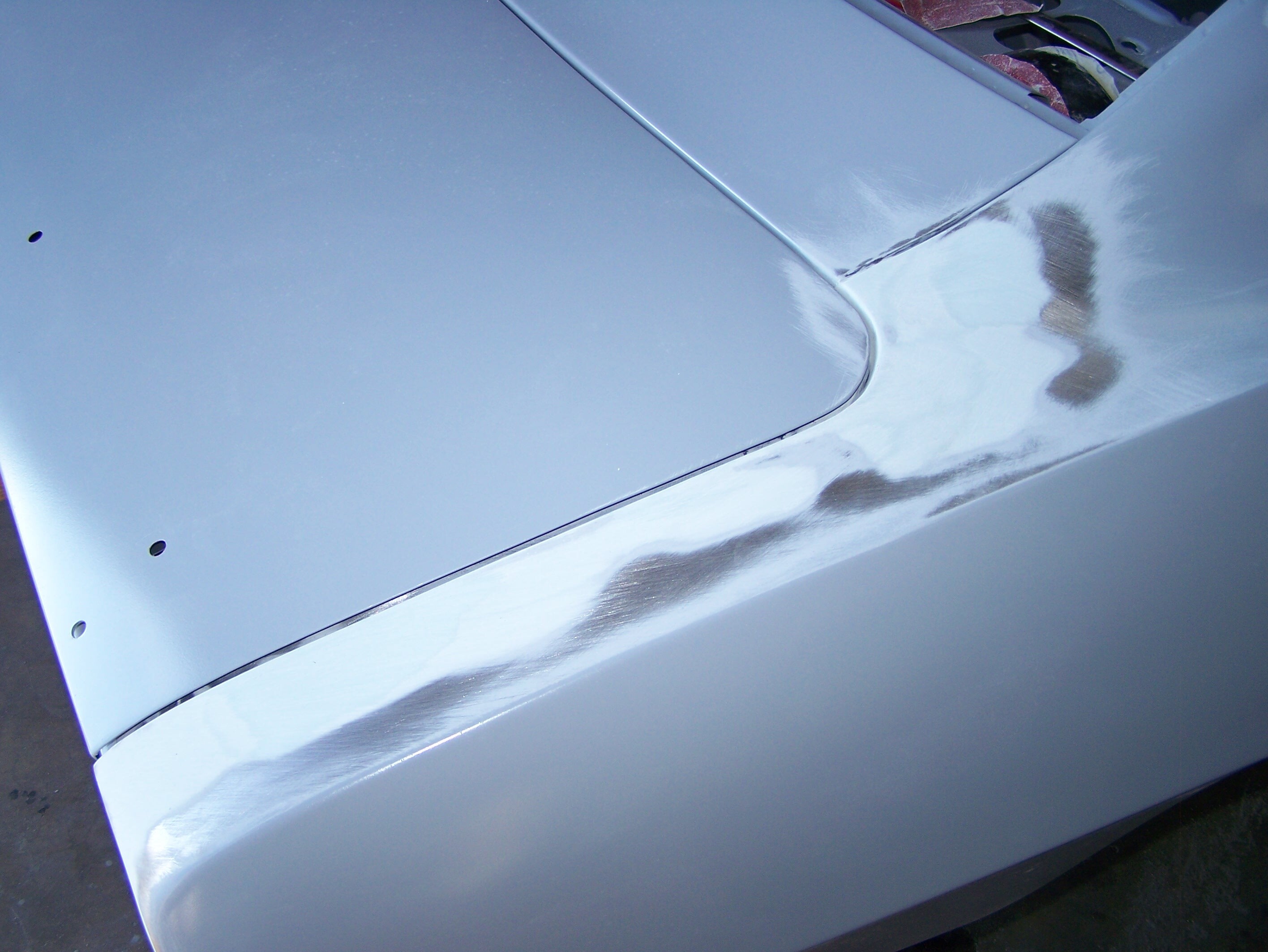 RDS delivers new bodies with door and trunk gaps fitted so the end user should have to do a minimum amount of “moving metal around”. To achieve these gaps, RDS often must cut/hammer and mig-weld the new panels into shape. RDS metal finishes these areas so a thin skim of filler can be applied to make the areas perfect. One area often metal-worked are the tops of the new quarters near the deck lid opening. We applied lightweight body filler, block sanded and feathered to areas previously metal-worked to achieve the final trunk gaps.