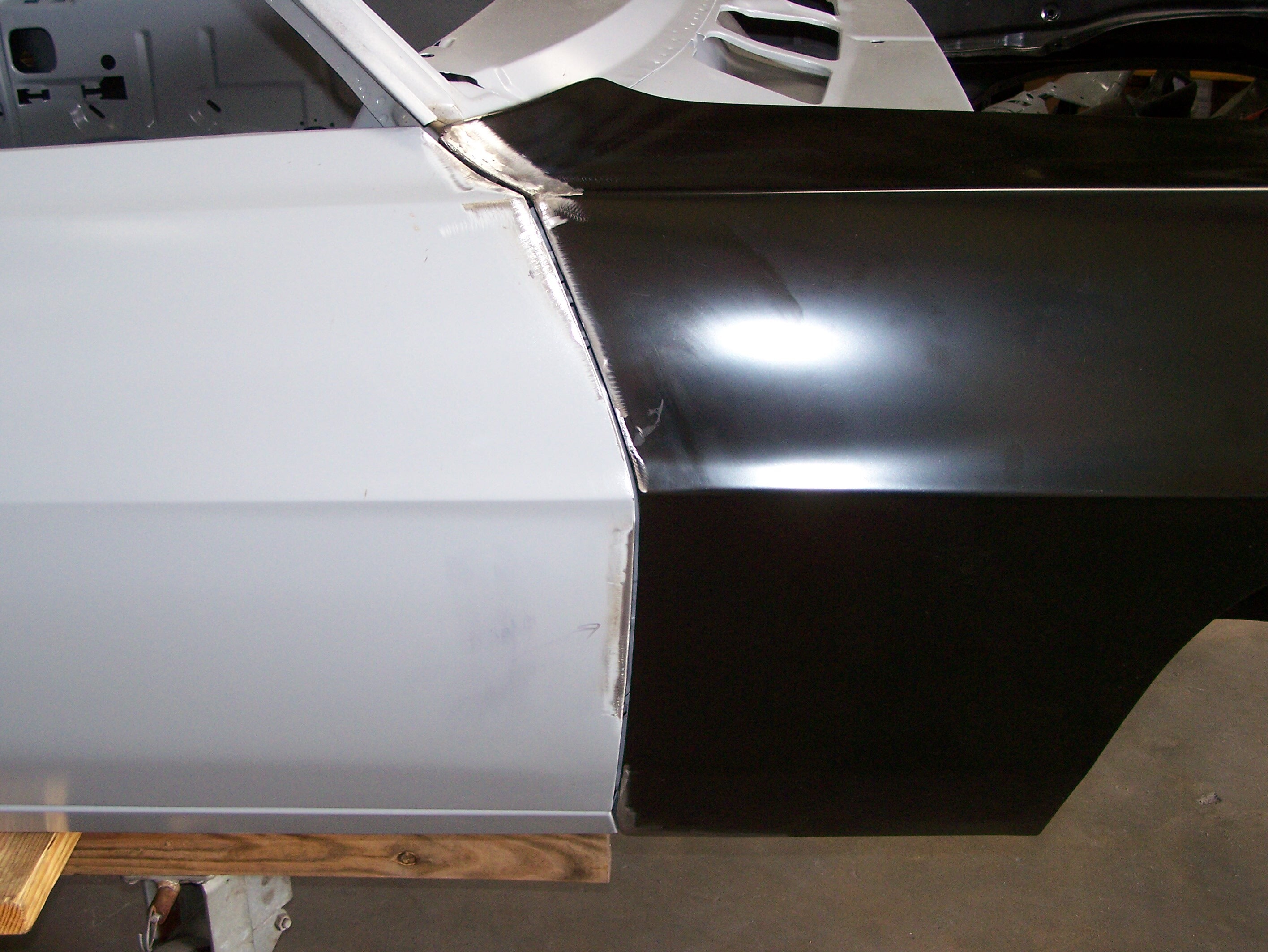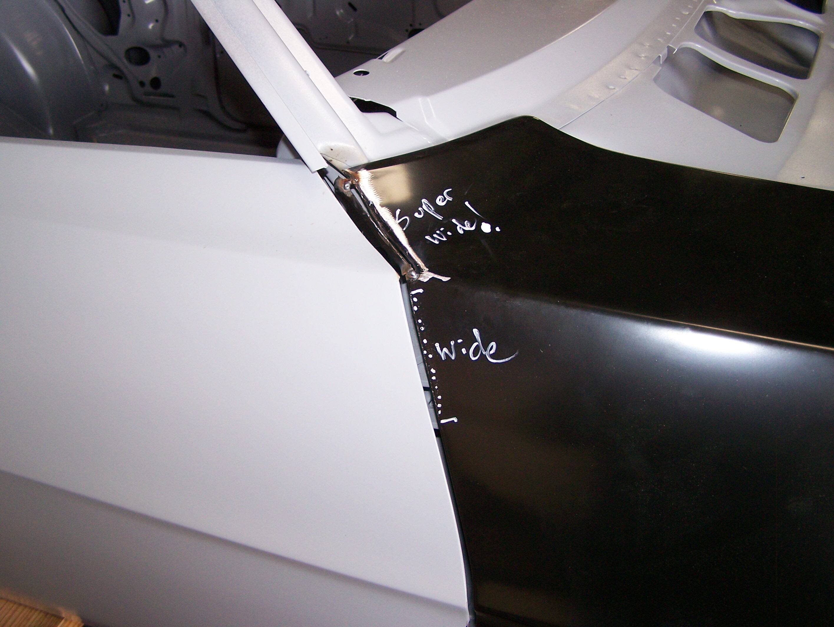 The gap between the top of the door and the fender on the left side was still poor, so both the door and fender were cut, reshaped and welded to achieve a better fit.